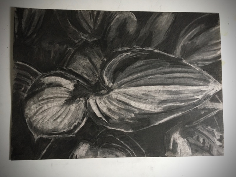 Here is a hosta that I did in charcoal by getting it all black on the page and then rubbing it away with a rubber and blending it with a blender.